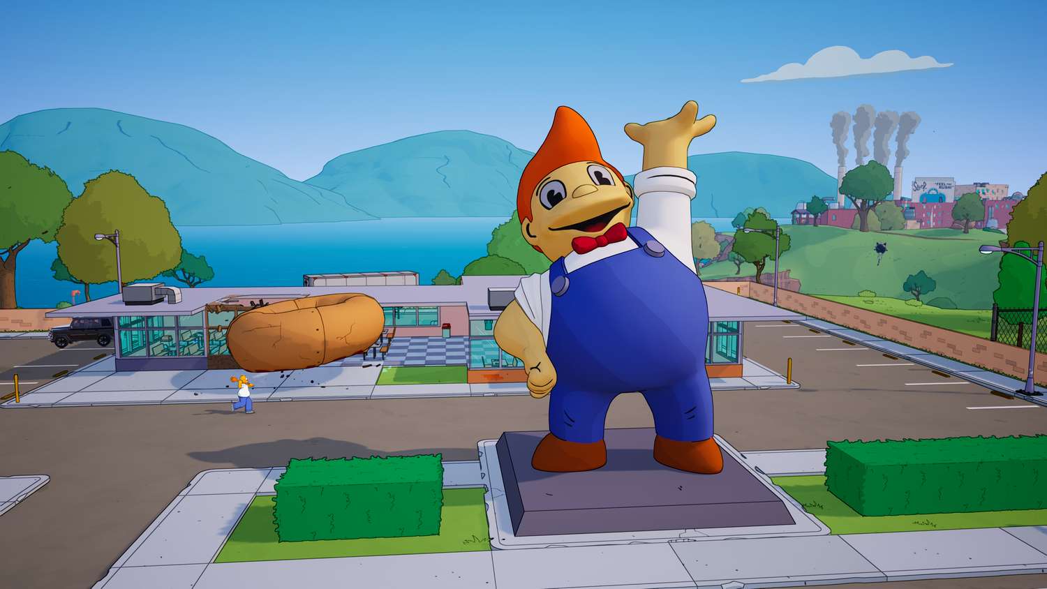 - Rotate to Springfield Town Square: This hub is packed with objectives. Complete ‘Step on a rake,’ ‘Prank call Moe,’ and ‘Knock the Jebediah Springfield statue’s head off.’ Purchase a Super Squishee from the Kwik-E-Mart vending machine.